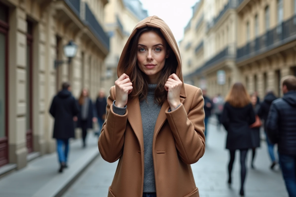 - Version chic : capuche fine sous manteau long, bottines, accessoires épurés.